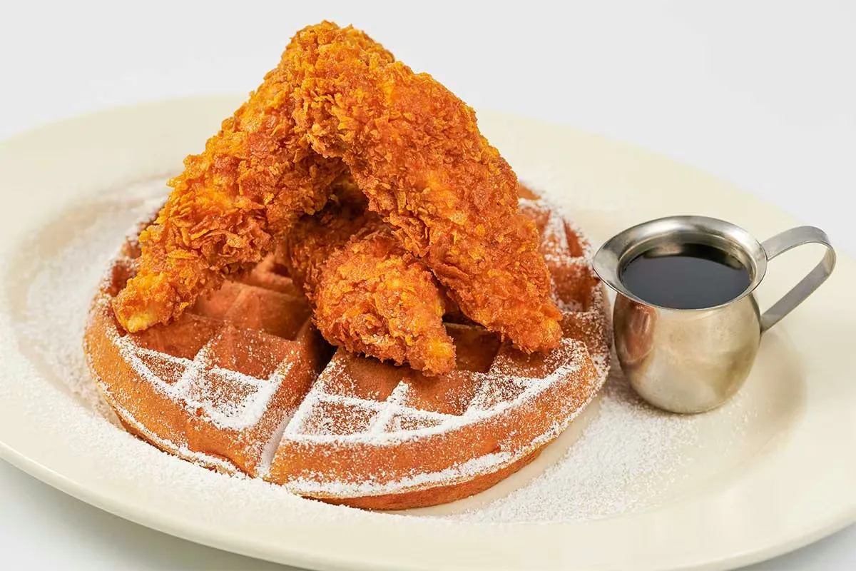Durante los fines de semana podrás pedir diferentes tipos de waffles: el clásico belga gigante (280 gramos con fresas, nueces caramelizadas y crema chantilly), Fried Chicken & Waffles (receta tradicional cubierto con tiras de pollo frito y miel de maple) y Fried Chicken & Waffles Benedict (medio waffle cubierto con tiras de pollo, dos huevos poché, salsa holandesa y jarabe de maple).
