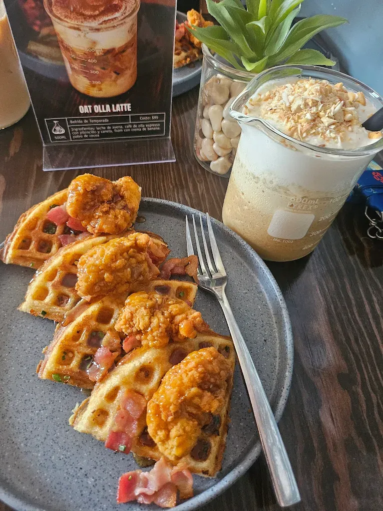 En este lugar ofrecen waffles ya sea dulces o salados. El dulce lo podrás armar a tu gusto con 2 frutas (moras, kiwi, fresa), 2 salsas dulces (cajeta, chocolate, nutella, lechera) y nieve de vainilla. Tienen dos opciones de waffles salados: Chicken & Waffle (con boneless empanizados, tocino, chile quebrado y maple) y Waffle Tesla (relleno de huevo revuelto, jamón ahumado y queso manchego).