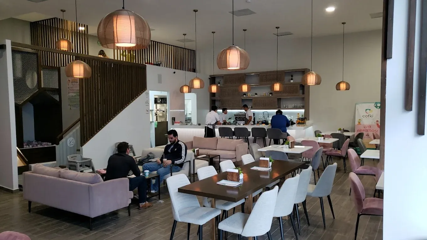 La ambientación en este lugar es minimalista y sencilla, con una paleta de colores neutros. Tiene dos tipos de actividades para niños, el área de juegos (con alberca de pelotas, cocinita y resbaladero) y manualidades (dibujos para colorear, acuarelas y pintar yeso). La zona para niños se encuentra en el segundo piso (con cámaras para observar), para que los padres puedan trabajar o platicar sin problema alguno. Su menú está dividido en tres secciones, desayunos (chilaquiles, toasts y bowls), comidas (pasta, arrachera y hamburguesa) y snacks (chips, gelato y pan dulce). Para los niños ofrecen un paquete llamado "Cofkibox Kids" que incluye pollo, mini burger o pizza, limonada o agua, y la actividad recreativa de la temporada.