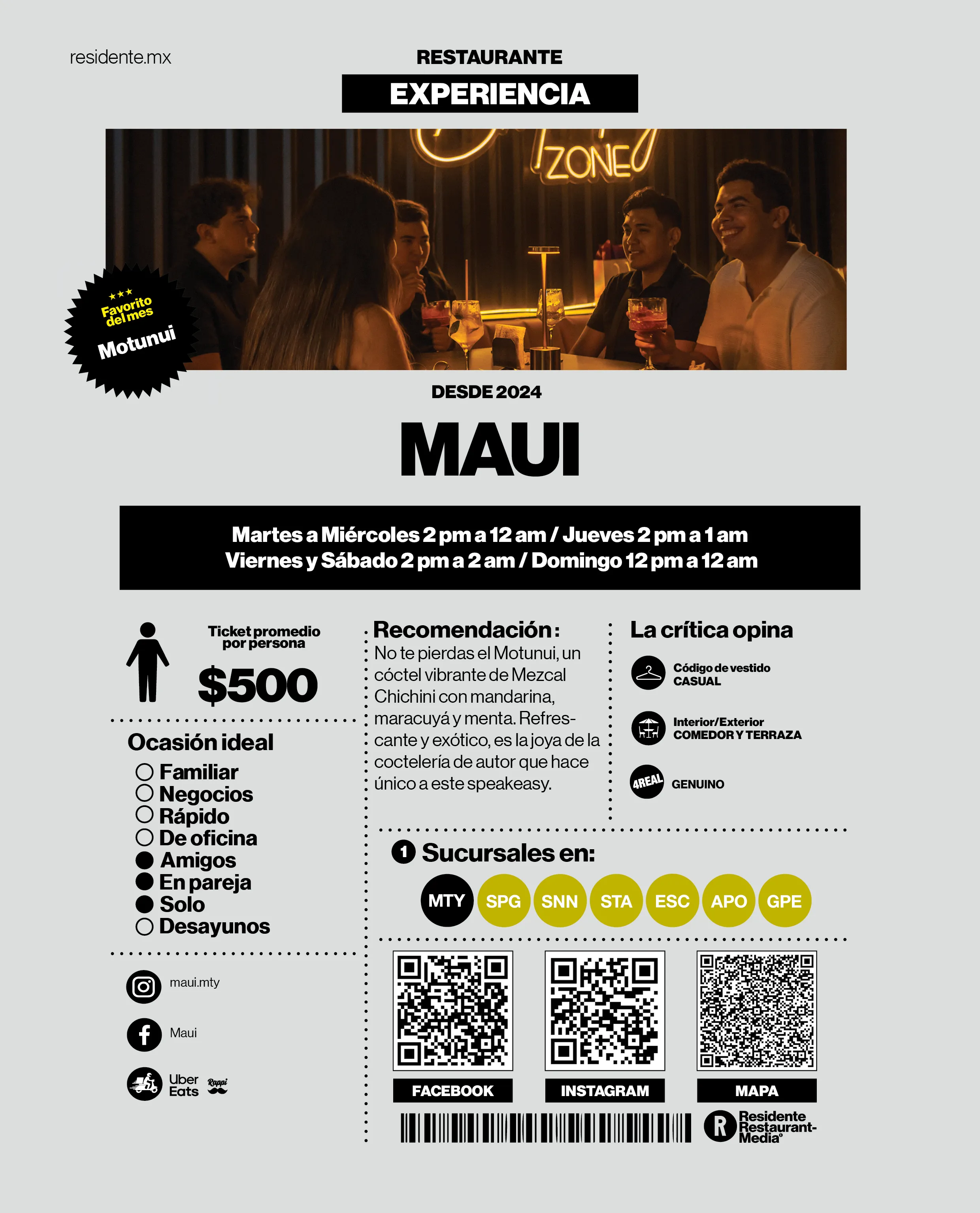octubre 14, 2025 13:11Coctelería de autor + ambiente íntimo = MAUIMAUI sobresale por su atmósfera íntima, perfecta para reuniones con amigos o familiares. ← Volver al listado