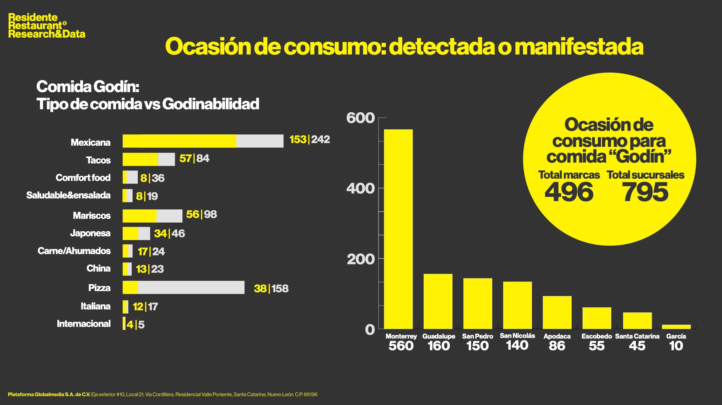 El dominio del fast casual se debe a su alta godinabilidad, es decir, su capacidad de adaptarse a las necesidades del consumo cotidiano del godín. Como resultado, la mayor concentración de restaurantes dentro de este formato se encuentra en tipos de comida altamente compatibles, como comida mexicana (153), tacos (57) y mariscos (56).