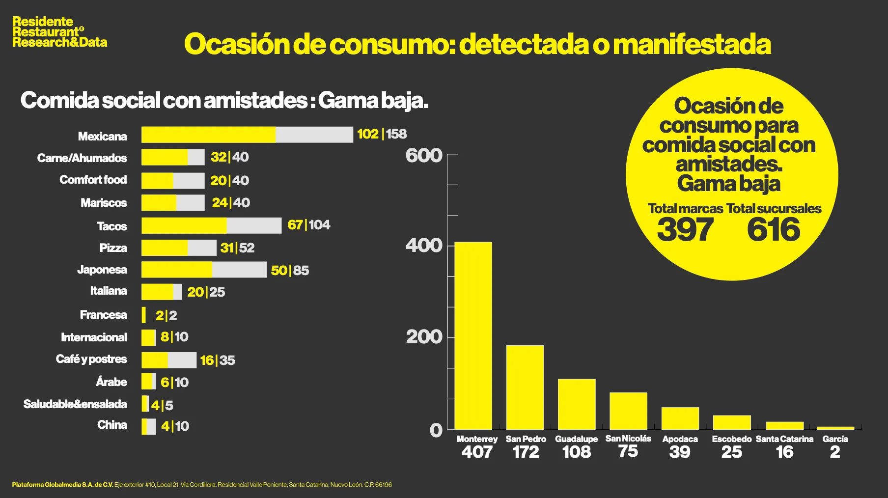 El estudio revela que la comida social en gama baja es uno de los segmentos con mayor dinamismo en el mercado restaurantero regiomontano, y dentro de él, la comida mexicana se consolida como una de las categorías con mayor crecimiento. De las 1,204 marcas identificadas en la categoría de gama baja, 922 pertenecen al formato fast casual ($150 - $250) y 282 a casual dining ($250 - $500).