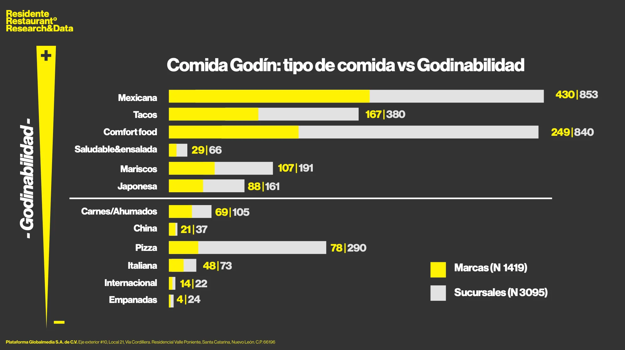 El concepto de Godinabilidad se refiere a la capacidad de un restaurante para adaptarse a las necesidades del consumo diario del consumidor godín, es decir, aquel que come fuera de casa de lunes a viernes y prioriza rapidez, precio accesible y ubicación conveniente. Nuevo León tiene 1,419 restaurantes identificados en esta ocasión de consumo godín, donde fast casual cuenta con 922 marcas, casual dining con 282, fast food con 196 y buffet con 19.