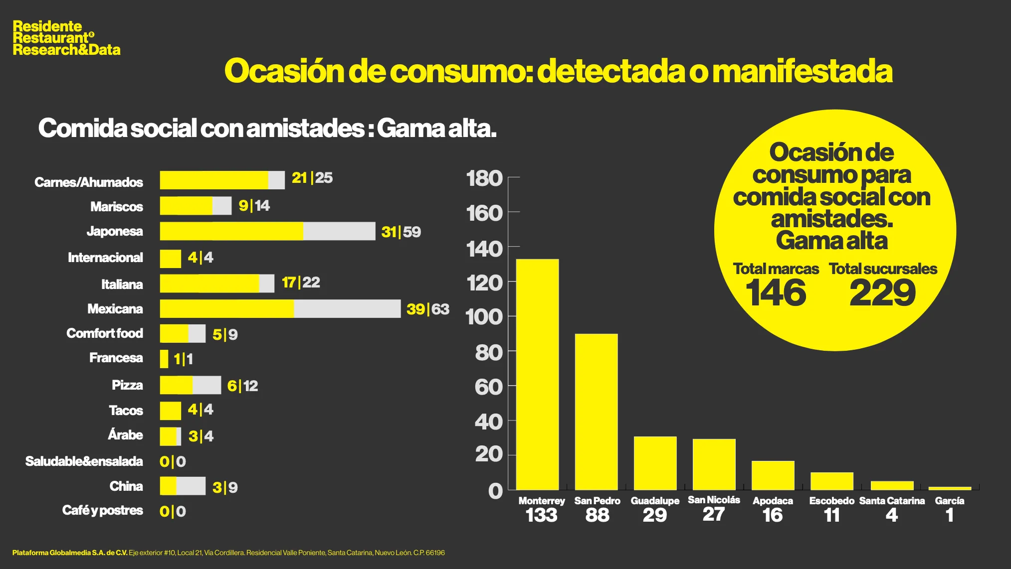 El estudio revela que si bien hay una amplia oferta restaurantera en Nuevo León de 1,672 marcas activas, solo 146 tienen un enfoque especializado para grupos de amigos. Además, los datos muestran un vacío claro en la categoría de cafés y postres como actividad social con presupuestos de gama alta.