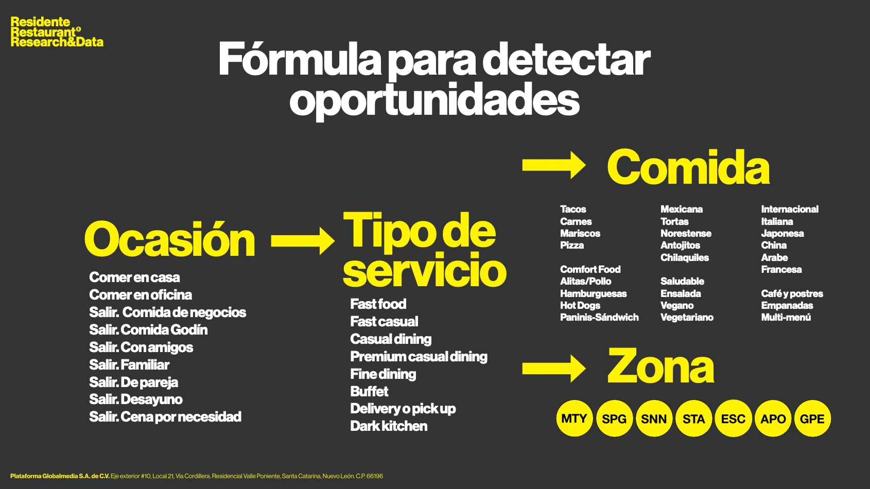 Dentro del estudio se propone la fórmula para detectar oportunidades, una herramienta de análisis que permite identificar, con base en datos reales del mercado, dónde existe una verdadera posibilidad de éxito para un restaurante. Esta metodología parte del comportamiento del consumidor y se construye a partir de cuatro variables clave: la ocasión de consumo, el tipo de servicio, el tipo de comida y la zona.