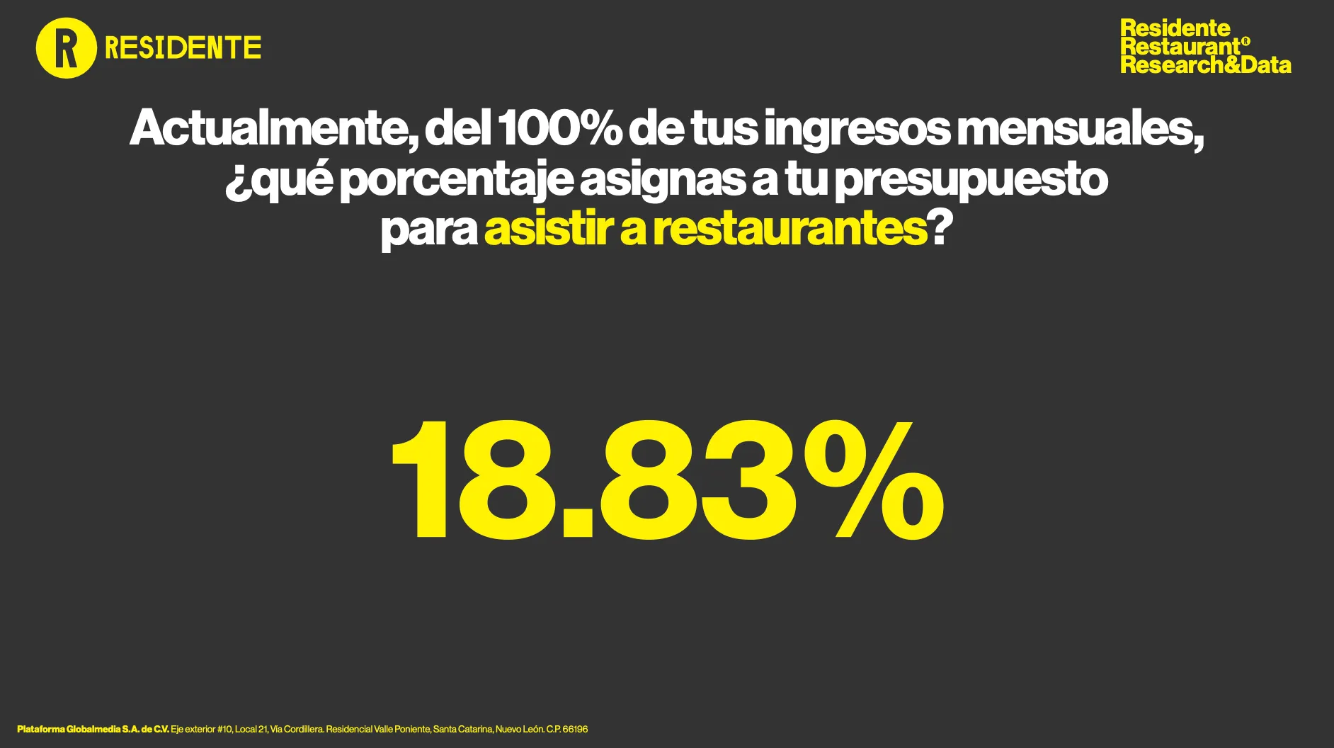 Años atrás, el gasto en restaurantes ya ocupaba un lugar relevante dentro del presupuesto de los hogares. En promedio, los consumidores destinaban el 18.83% de su ingreso mensual a comer en restaurantes, el cual refleja no solo un hábito consolidado, sino también una transformación en el estilo de vida urbano. Comer en restaurantes había dejado de ser una actividad ocasional para convertirse en parte de la rutina diaria: comidas entre semana, reuniones sociales y salidas en fin de semana.
