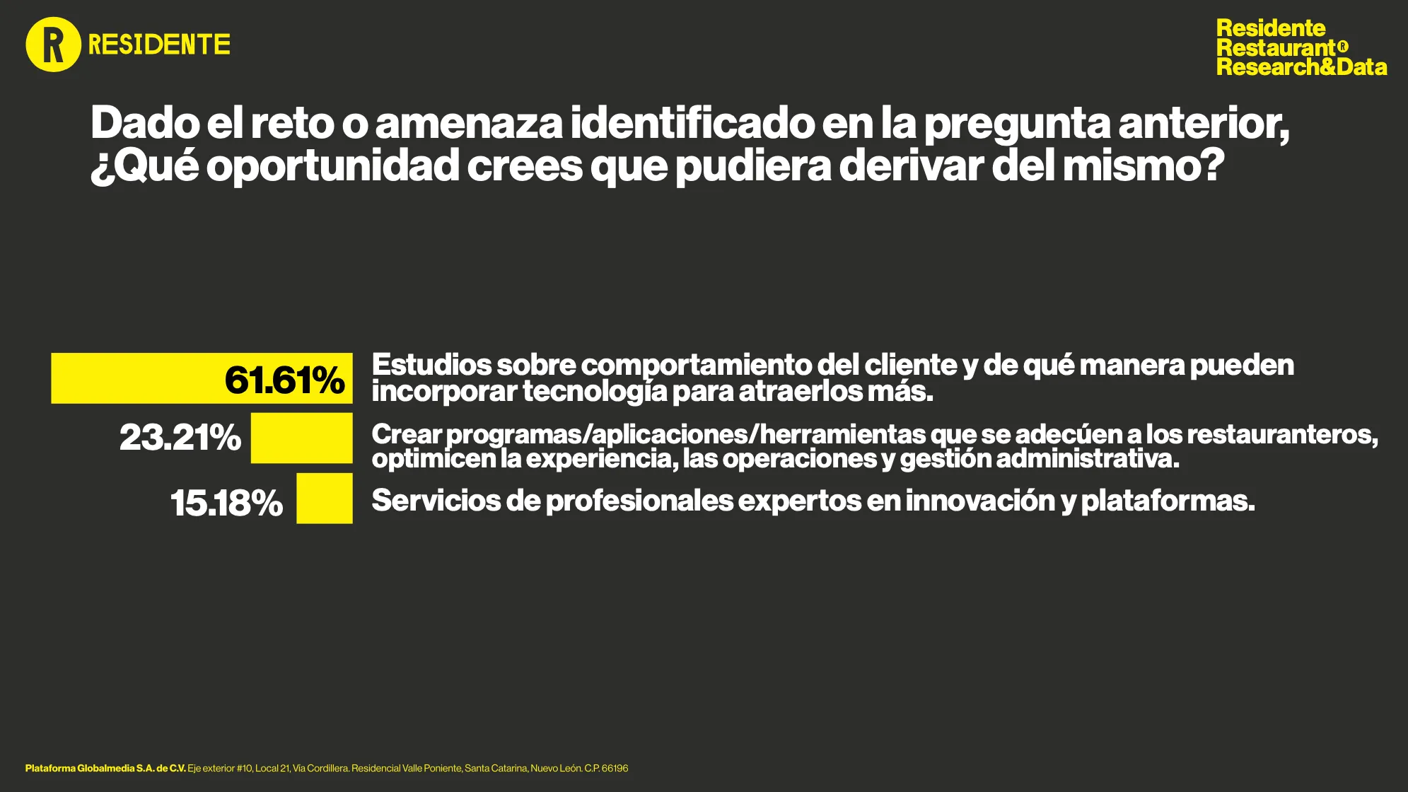 Frente a este cambio, la reacción del operador restaurantero debe ser estratégica y basada en datos duros. El estudio muestra que el 61.6% de los expertos identifica como oportunidad el desarrollo de servicios y herramientas tecnológicas diseñadas específicamente para atraer y entender al cliente, mientras que otro 23.21% apunta a la creación de programas y sistemas que optimicen la experiencia y la operación.