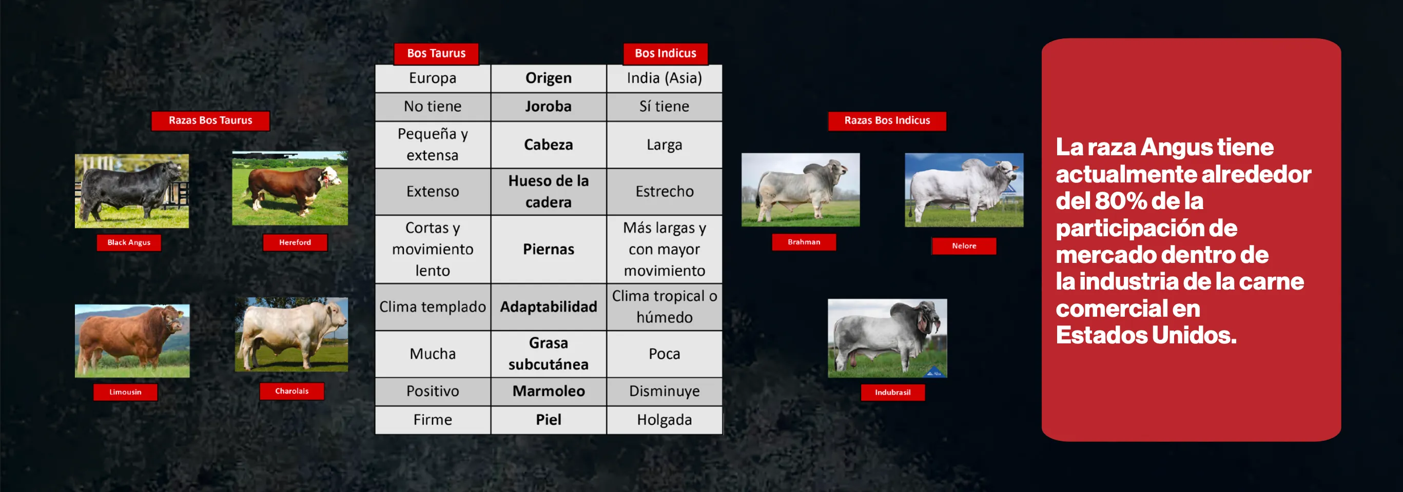 La genética es fundamental para obtener carne de alta calidad. Dos tipos principales de genéticas dominan el mercado: •Bos Taurus: Donde se desprenden las razas europeas Black Angus, Herford, Limousin y Charolais, conocidas por su capacidad para producir carne con excelente marmoleo. •Bos Indicus: Originario de Asia, conocido como el ganado cebú. Entre sus razas se pueden encontrar Brahman, Indubrasil y Nelore, tendiendo como ventaja una mayor adaptabilidad a climas cálidos, aunque con menor tendencia al marmoleo.