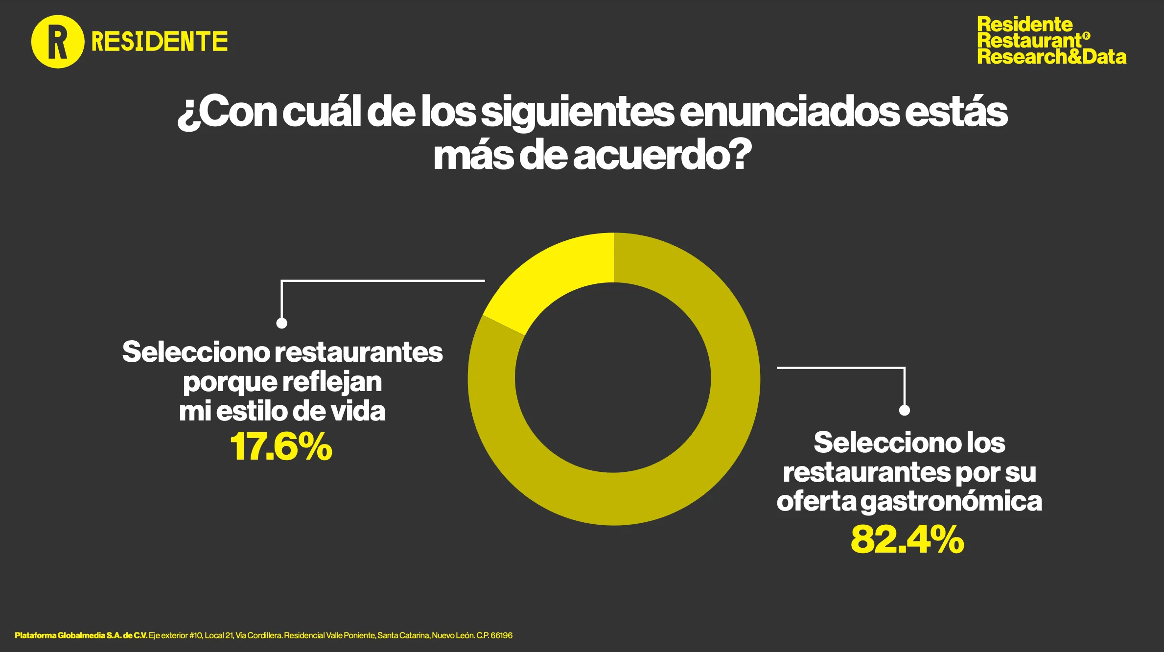 Aunque podría pensarse que el comensal elige restaurantes que reflejen estatus, tendencias o proyección social, el estudio revela que más del 80% de los consumidores selecciona restaurantes por su oferta gastronómica, y no por el estilo de vida que el lugar comunica.