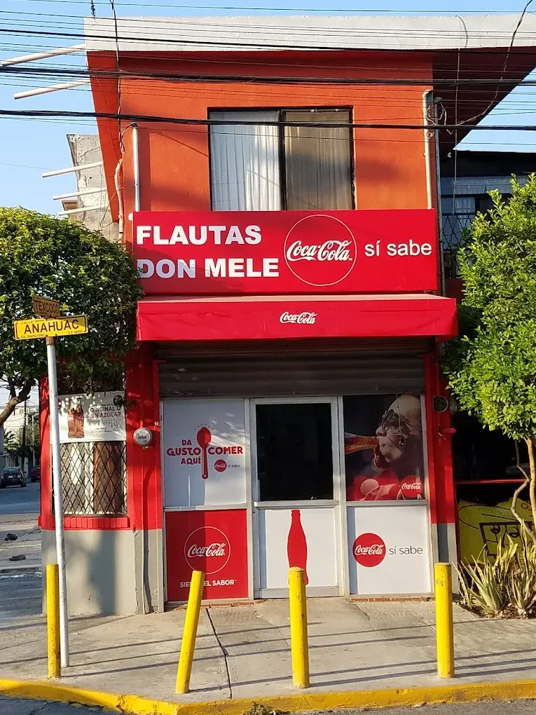 El local de Flautas Don Mele se ubica a la orilla de la colonia residencial de Anáhuac en San Nicolás. Es un lugar pequeño y clásico, su decoración recuerda a las casas y estructuras de antaño. Sus muebles son las clásicas sillas y mesas de color rojo con el logo de Coca-Cola. Cuentan con una pantalla pequeña para transmitir partidos y aire acondicionado. Están abiertos de martes a domingo de 12 p.m. a 10 p.m. El local es un lugar de tradición en San Nicolás y muchos de sus comensales comen aquí por la recomendación de sus padres y sus abuelos.
