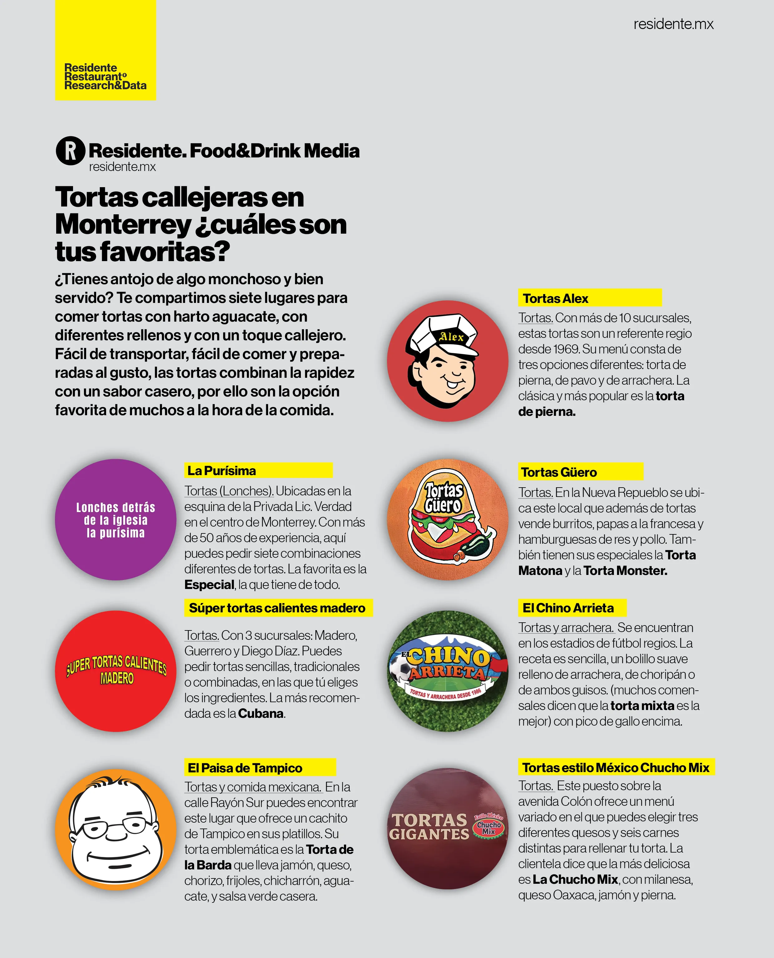 Tortas. Con más de 10 sucursales, estas tortas son un referente regio desde 1969. Su menú consta de tres opciones diferentes: torta de pierna, de pavo y de arrachera. Todas con aguacate, vegetales frescos y un toque de mayonesa o crema. Puedes pedir tu torta en individual o en combo: con una orden de papas a la francesa y un refresco frío. La clásica y más popular es la torta de pierna.