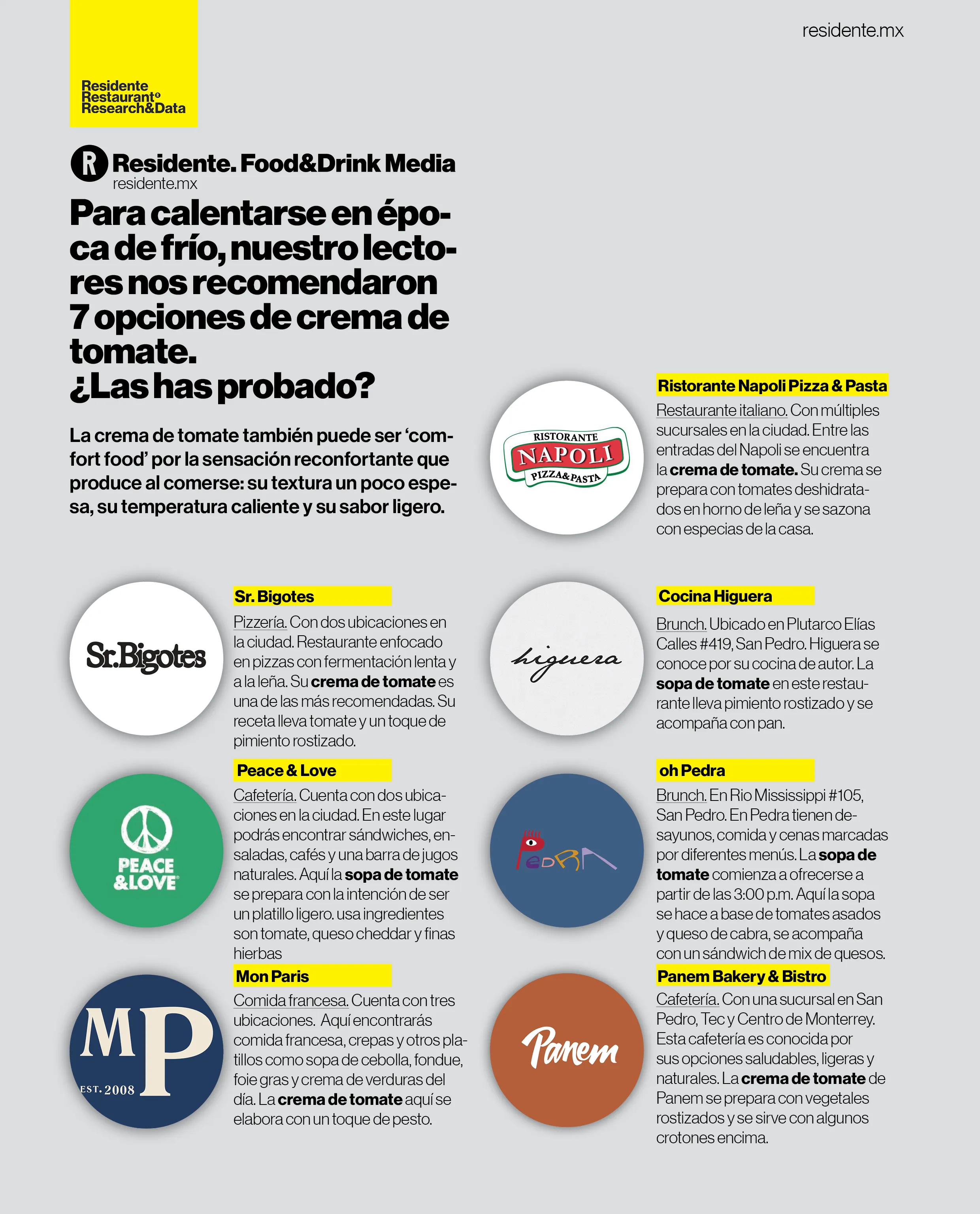 Aquí te compartimos 7 restaurantes recomendados por nuestros lectores que ofrecen sopa de tomate, cada uno con sopa en diferentes presentaciones, variaciones en ingredientes y distintas guarniciones.