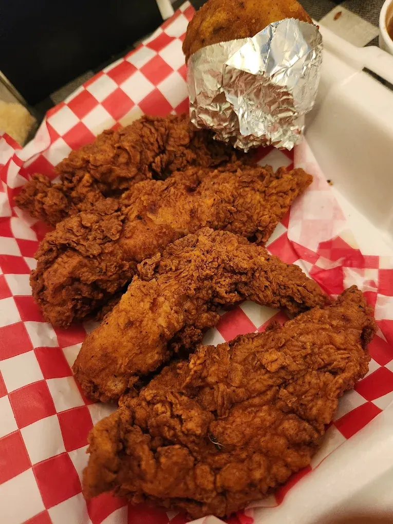El pollo frito que ofrecen en Chick’n Blues es al estilo cajún de Louisiana. El pollo se vende por paquetes (tenders + complemento o pierna y muslo + complemento) o por piezas individuales. Para acompañar tienen muffins (naturales, de elote o de queso con tocino), papas Louisiana, puré con gravy y ensalada de col. Se recomienda llegar a tiempo, ya que el producto suele agotarse rápidamente.