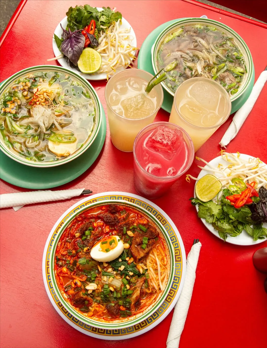 Un pho bar con un estilo sencillo y relajado con colores contrastantes y un ambiente lleno de vida. En su menú puedes encontrar rollos primavera, pho bo tai (res), pho ga (pollo), ensalada vietnamita, ramen, helado suave y té del día. Se recomienda probar los rollos primavera.