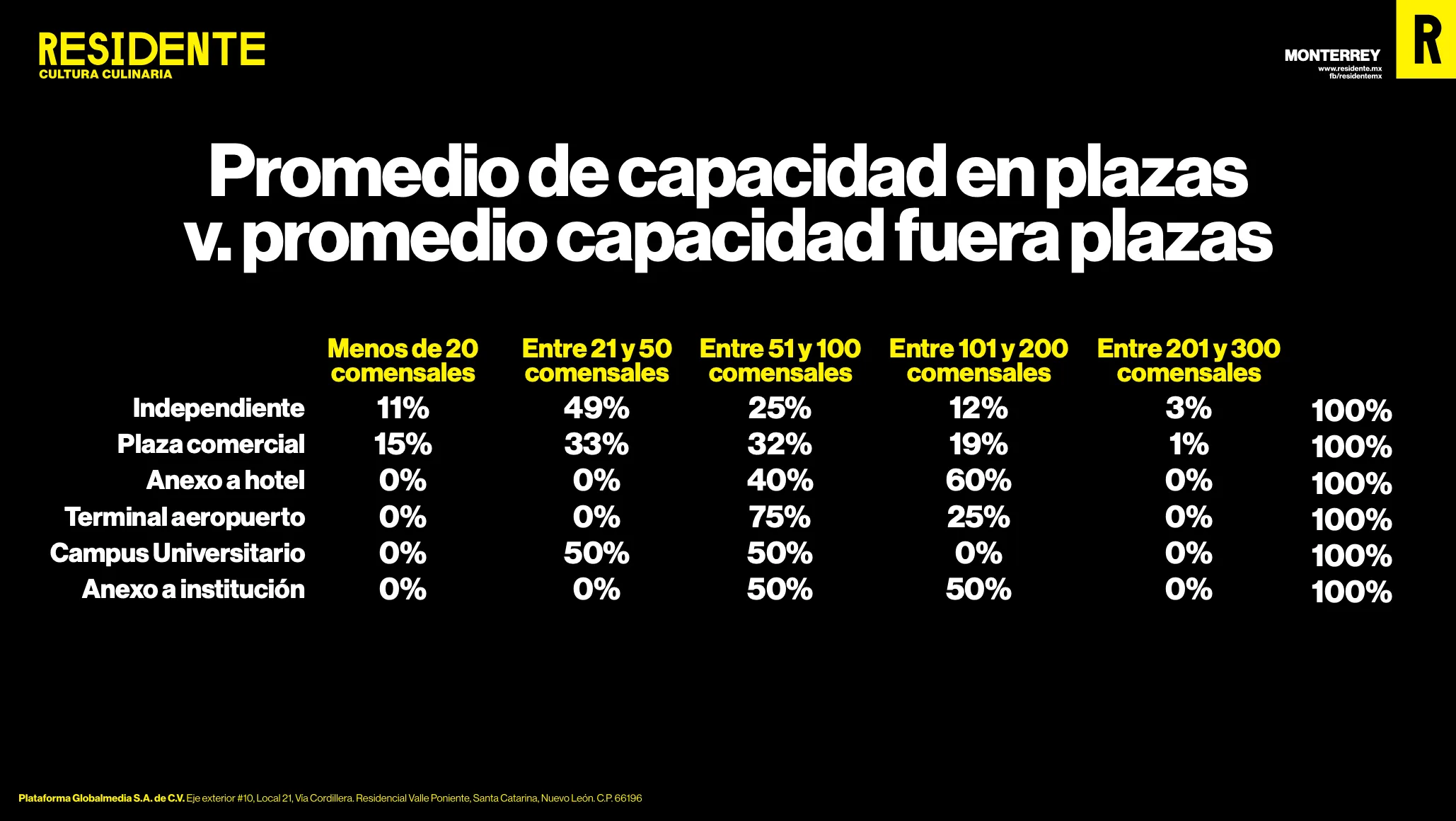 El estudio muestra que los restaurantes de mayor capacidad (101 a 300 comensales) sostienen precios promedio más altos, lo cual es más viable en plazas; mientras que los locales pequeños funcionan mejor con tickets bajos y alta rotación, algo más natural en ubicaciones independientes bien ubicadas.