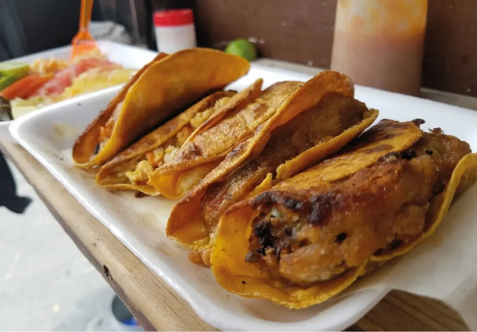 Sus especialidades son los tacos de cabeza de res, pierna y chicharrón, preparados en tortilla de maíz o harina y dorados a la plancha con aceite. También ofrecen de picadillo, frijol con tocino, huevo con chorizo y chile relleno de queso o carne.