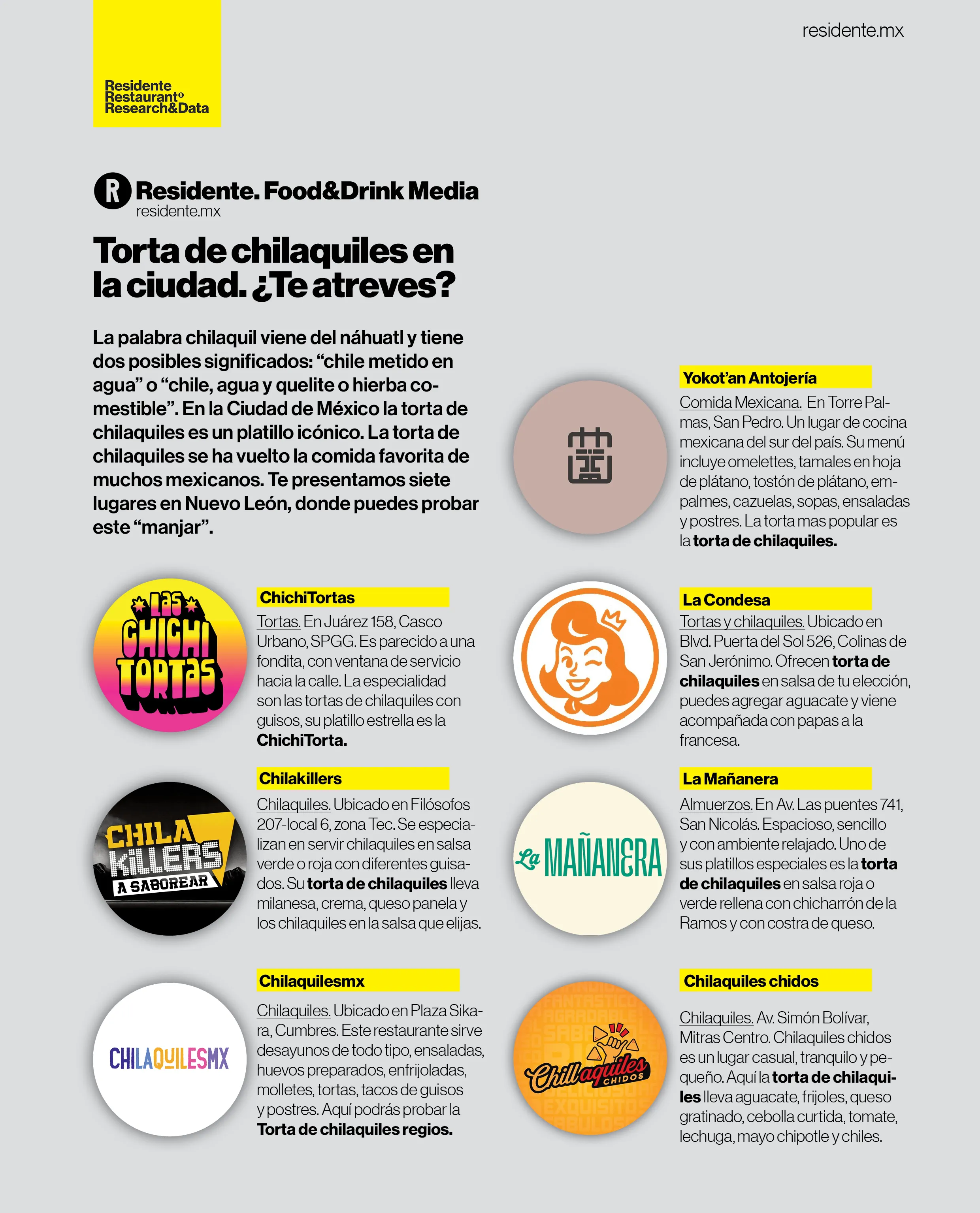 Chilaquiles al estilo de Ciudad de México. El lugar es pequeño, pero acogedor. Se especializan en servir chilaquiles en salsa verde o roja con diferentes guisados: arrachera, huevo, milanesa, pollo y chicharrón en salsa verde . Su torta de chilaquiles lleva milanesa, crema, queso panela y los chilaquiles en la salsa que elijas. Además de chilaquiles también ofrecen huevos al gusto y enchiladas rojas, verdes o suizas.